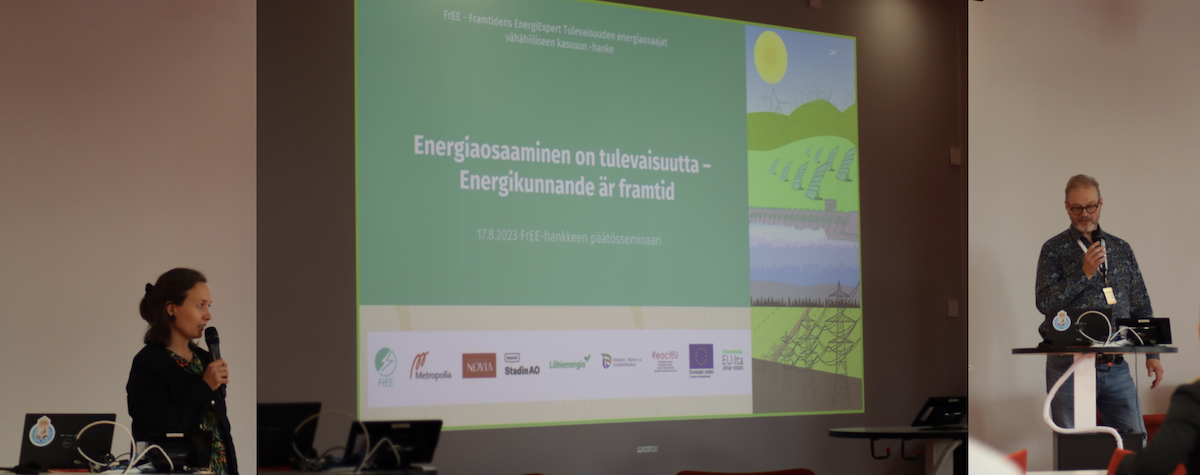 FrEE-hankkeen päätösseminaari Energiaosaaminen on tulevaisuutta – Energikunnande är framtid pidettiin Metropolian Myllypuron kampuksella 17.8.2023. Mukana oli huikeat puhujat ja kiinnostavaa keskustelua. Kaksivuotinen FrEE-hanke tuli päätökseen ja verkossa käytettävä koulutusmateriaali on valmistunut. Tilaisuus videointiin ja se julkaistaan lähiaikoina Lähienergialiiton sivuilla.