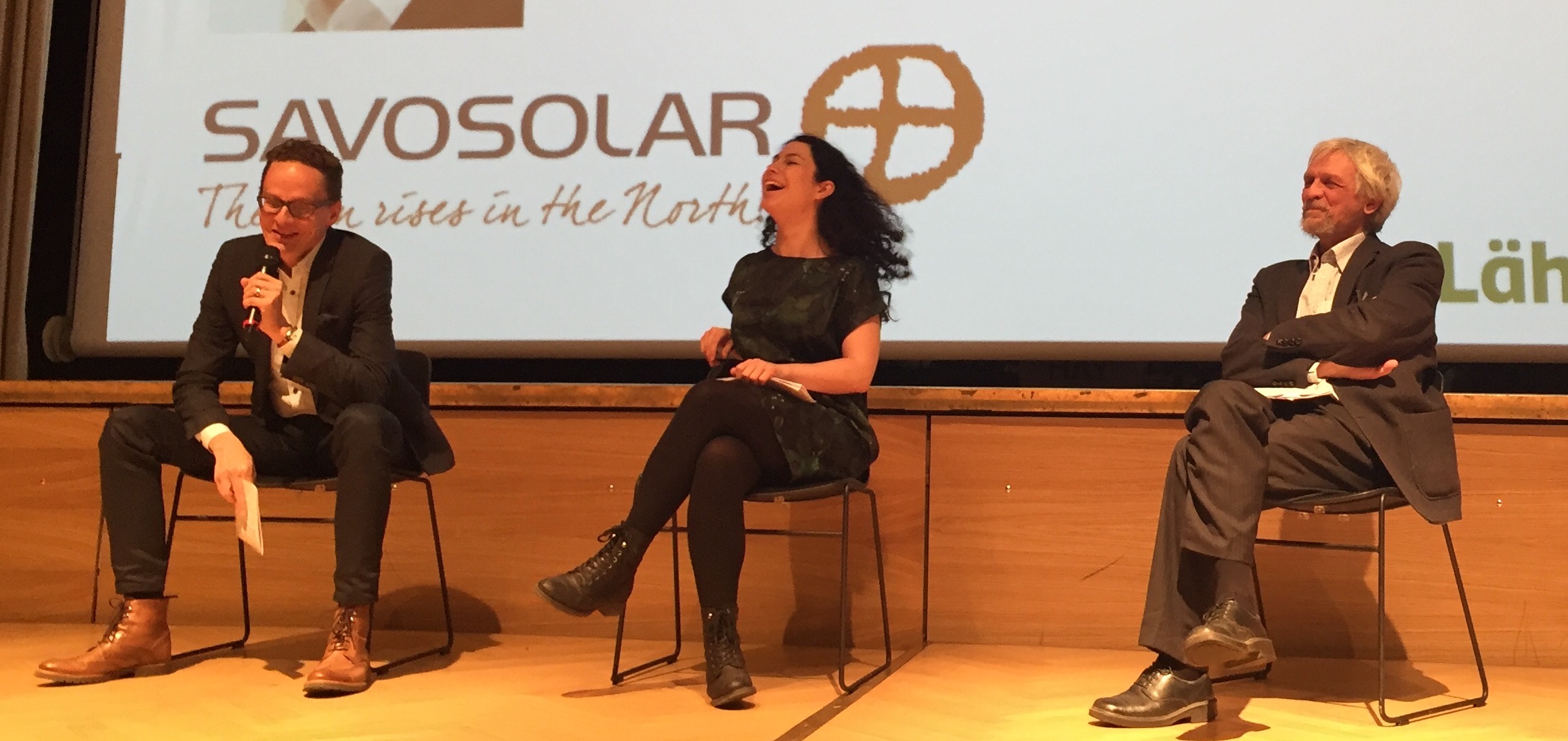 Valkoisessa salissa järjestetyssä Hyvää energiaa stadissa -tilaisuudessa sai hyvät tiedot uusiutuvan energian potentiaalista ja sen hyödyntämisestä Helsingissä. Raimo Lovion johtamassa paneelikeskustelussa Emma Kari, Tatu Rauhamäki ja Pentti Arajärvi käsittelivät kiinnostavia kysymyksiä, kuten ”milloin voimme aloittaa ensimmäisen tuulivoimalan rakentamisen Helsinkiin?”.