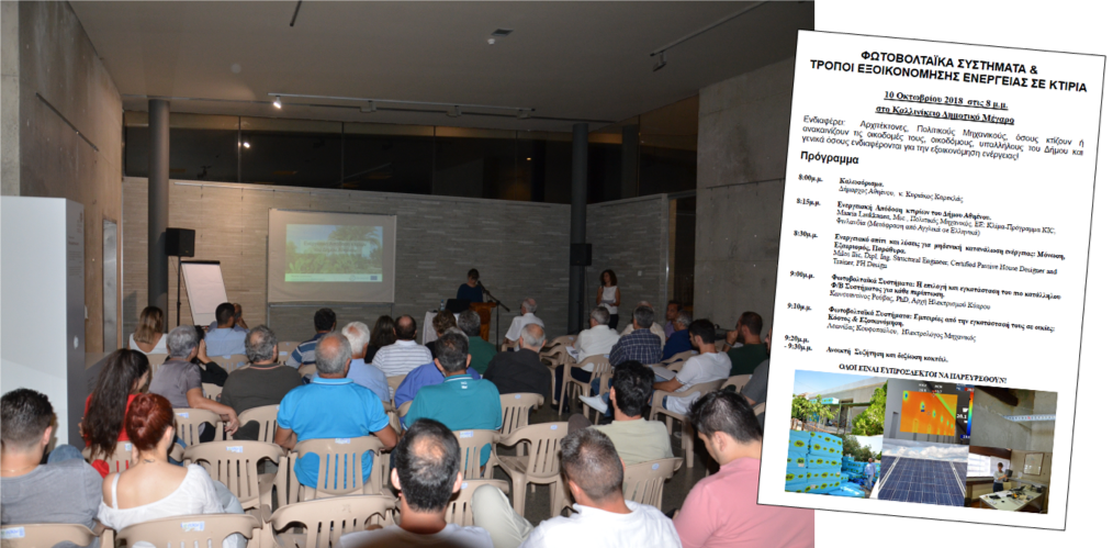 Tapahtumailtana penkit alkoivat täyttyä hyvän aikaa ennen virallista alkua. Minulle kerrottiin että mikään aihe ei ole kiinnostanut yhtä paljon. Energia on Kyproksella kallista, joten aihe koskee monia. Paikalle tuli nykyisen pormestarin lisäksi uteliaina kuuntelemaan myös aikaisempia pormestareita. Kannustin kuuntelijoita tulkin avulla panostamaan energiatehokkuuteen sekä pidin lyhyen katsauksen rakennuksia koskevista havainnoista. Seuraavaksi paikallinen passiivitalojen asiantuntija luennoi ilmanvaihdosta, ikkunoista ja eristämisestä. Energiayhtiöstä tultiin kertomaan aurinkosähköliittymistä ja aurinkosähköjärjestelmien mitoittamisesta. Viimeiseksi esiintyi paikallinen aurinkosähkösysteemit katolleen asentanut sähköinsinööri, joka näytti kännykän kautta tietoa toteutuneesta tuotosta ja kertoi kilpailutuksesta. Ihmiset eivät meinanneet lähteä tapahtumasta kotiin, vaan kysymyksiä ja kiihkeääkin keskustelua riitti myöhään. Ajattelin että se on varmasti hyvä juttu.