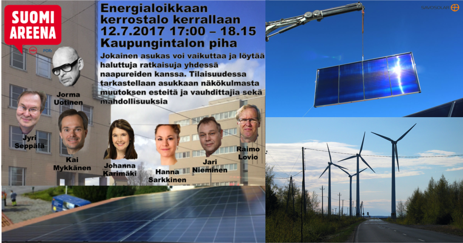 Suomessa asunnoista 45 % on kerrostaloja. Niissä asuu valtaosa suomalaisista. He päättävät asuntonsa energiamuodoista – vai päättävätkö? SuomiAreenassa 12.7.2017 17.00 – 18.15 (Kaupungintalon piha, Hallituskatu 12, Pori) Lähienergialiitto järjestää yhdessä Suomen ympäristökeskus SYKE kanssa keskustelutilaisuuden Energialoikkaan kerrostalo kerrallaan, jossa on tavoitteena valaista niin asukkaiden, taloyhtiöiden kuin kaupunkien tiekarttoja kohti uusiutuvien energioiden ratkaisuja. Tilaisuuden juontaa Jorma Uotinen ja keskustelemassa ovat ulkomaankauppa- ja kehitysministeri Kai Mykkänen, Vasemmistoliiton varapuheenjohtaja Hanna Sarkkinen, Vihreiden kansanedustaja Johanna Karimäki, Suomen ympäristökeskuksesta professori Jyri Seppälä, Lähienergialiiton puheenjohtaja, professori Raimo Lovio ja Isännöitsijä 2016 -tittelin saanut Jari Nieminen.