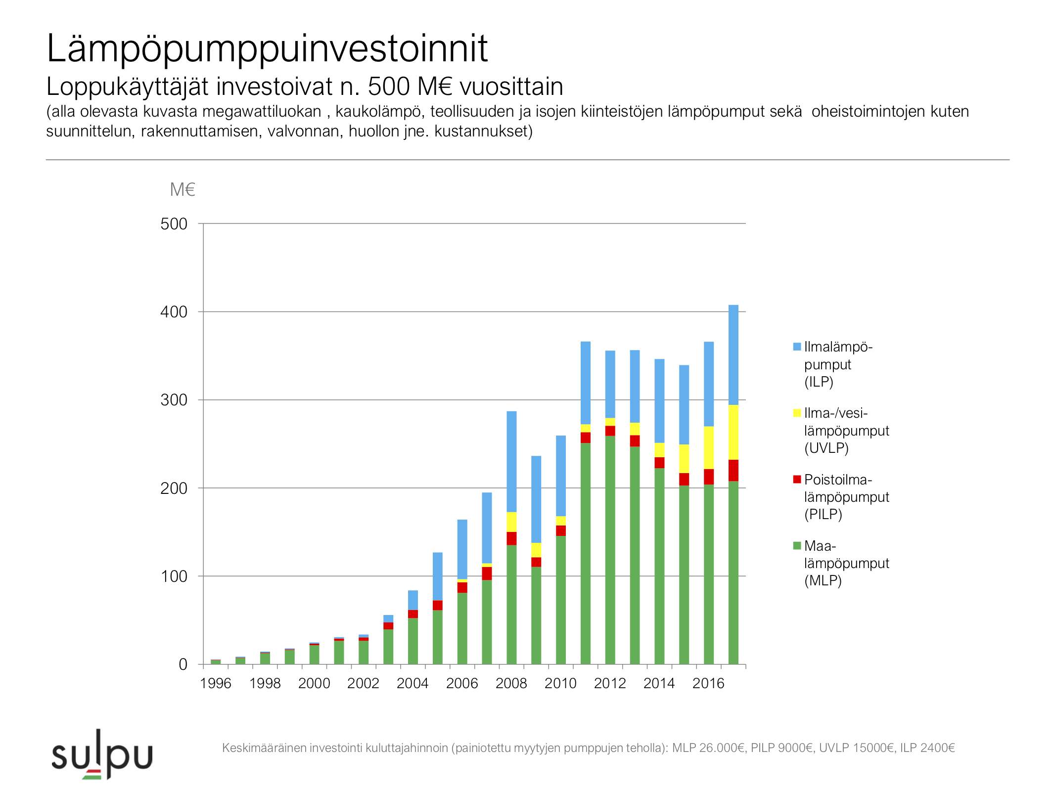 Kun siihen lisätään SULPUn tilastoista puuttuvat megawattiluokan lämpöpumppujärjestelmät kaukolämmön/-jäähdytyksen tuotantoon, teollisuuteen, kauppakeskuksiin ja muihin palvelurakennuksiin sekä lämpöpumppuliiketoiminnan oheistoiminnot kuten suunnittelu, toimitusvalvonnat, huollot ja muut palvelut, niin päädyttiin lämpöpumppualalla vuonna 2017 jo noin puolen miljardin vuosi-investointitahtiin.