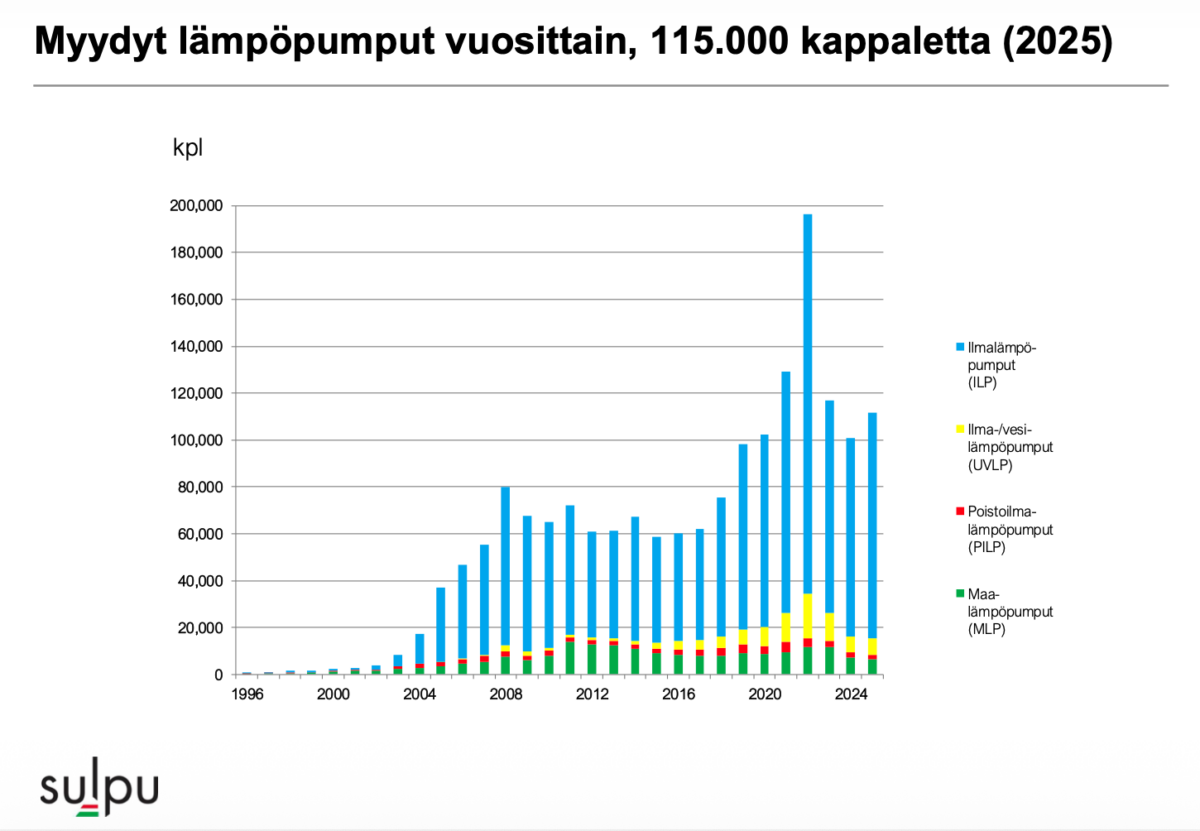 Vuonna 2025 Suomessa myytiin 112 000 lämpöpumppua. Suomen lämpöpumppuyhdistys SULPUn tilastojen mukaan Lämpöpumppujen myynti kasvoi 10,7 % edellisen vuoden luvuista. Vuonna 2025 Suomessa myytiin lämpöpumppujärjestelmiä yli 600 miljoonalla eurolla. Suomeen myytyihin 1,8 miljoonaan lämpöpumppuun on investoitu 10 miljardia euroa. Sekä uudis- ja saneerausrakentamisen alho ja ennen kaikkea talouden ja kotitalouksien investointi-ilmapiirin synkkyys hidastaa edelleen kaikkia investointeja, niin myös lämpöpumppuihin.