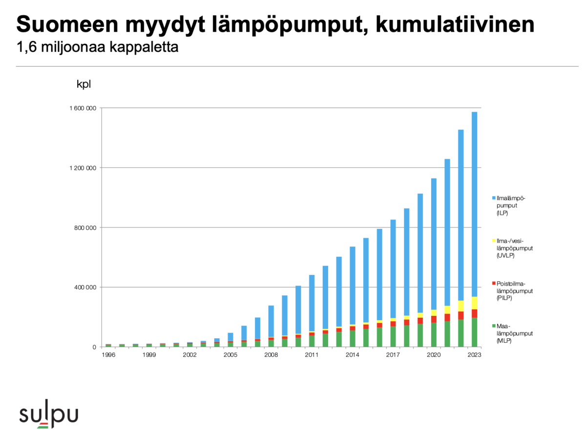 Vuonna 2023 myytiin vähän vajaat 120 000 lämpöpumppua. Suomen lämpöpumppuyhdistys SULPUn tilastojen mukaan Lämpöpumppujen myynti laski 40 % huippuvuoden 2022 yli 50 % nousun jälkeen. Vuonna 2023 myynnin normalisoitumiseen vuoden 2021 tasolle vaikutti edellisen todellisen huippuvuoden lisäksi rakentamisen hiipuminen, korkojen nousu ja talouden ja kotitalouksien investointi-ilmapiirin synkistyminen.
