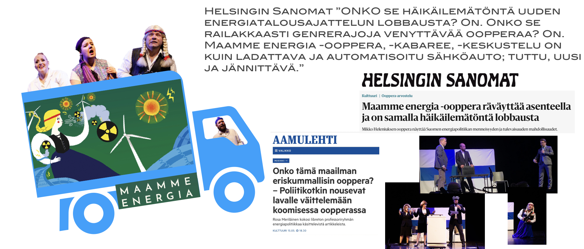 Maamme energia -oopperan kantaesitys nähtiin 17.5.2018 Savoy-teatterissa ja toinen esitys 18.5.2018. Näistä esityksistä artikkelissa ”Maamme energia -ooppera räväyttää asenteella ja on samalla häikäilemätöntä lobbausta” lisätietoja.