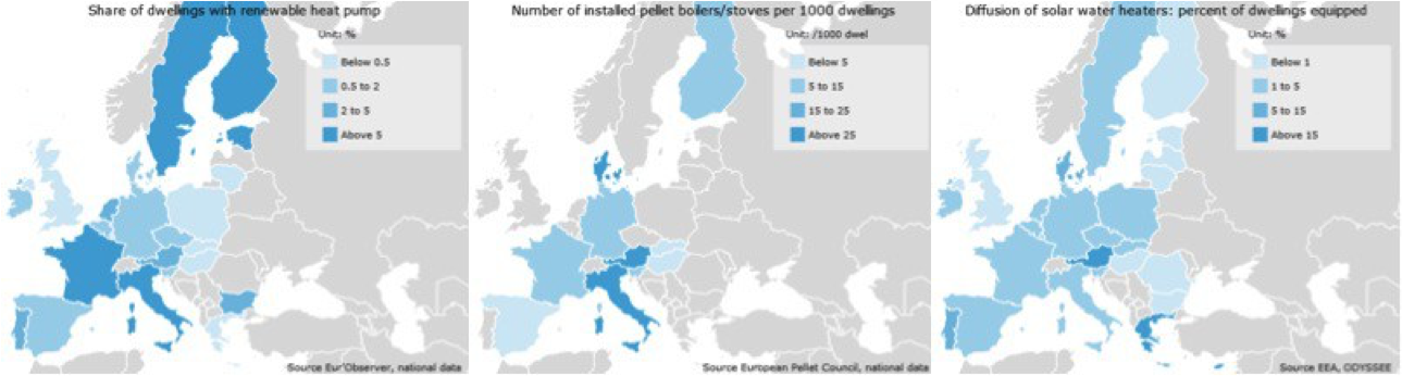 Maiden välillä on tärkeitä eroja siinä, mitä kilpailevia tai täydentäviä ratkaisuja kussakin maassa on tarjolla. Esimerkiksi kattava kaasu- tai kaukolämpöverkko on kova kilpailija uusille lämmitysratkaisuille. Myös eri ratkaisujen uskottavuudessa on eroja riippuen siitä miten ne istuvat paikalliseen kulttuuriin ja infrastruktuuriin ja siitä, kuinka ja miten otolliseen aikaan asiantuntijat, sosiaaliset liikkeet ja media ovat esitelleet niitä, ja minkä ensikokemukset kuluttajat ovat niistä saaneet. Politiikalla on vaikutuksensa, mutta yksittäisten tekijöiden lisäksi keskeisiä ovat pitkäaikaiset panostukset markkinoiden ja osaamisen sekä infrastruktuurin kehittämiseen.