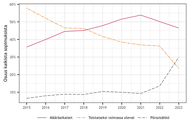 Toistaiseksi voimassa olevien sopimusten osuuden lasku jyrkentyi vuoden 2023 aikana. Vuoden 2023 lopussa 24 prosenttia sopimuksista oli toistaiseksi voimassa olevia. Laskua edellisestä vuodesta oli 12 prosenttiyksikköä.