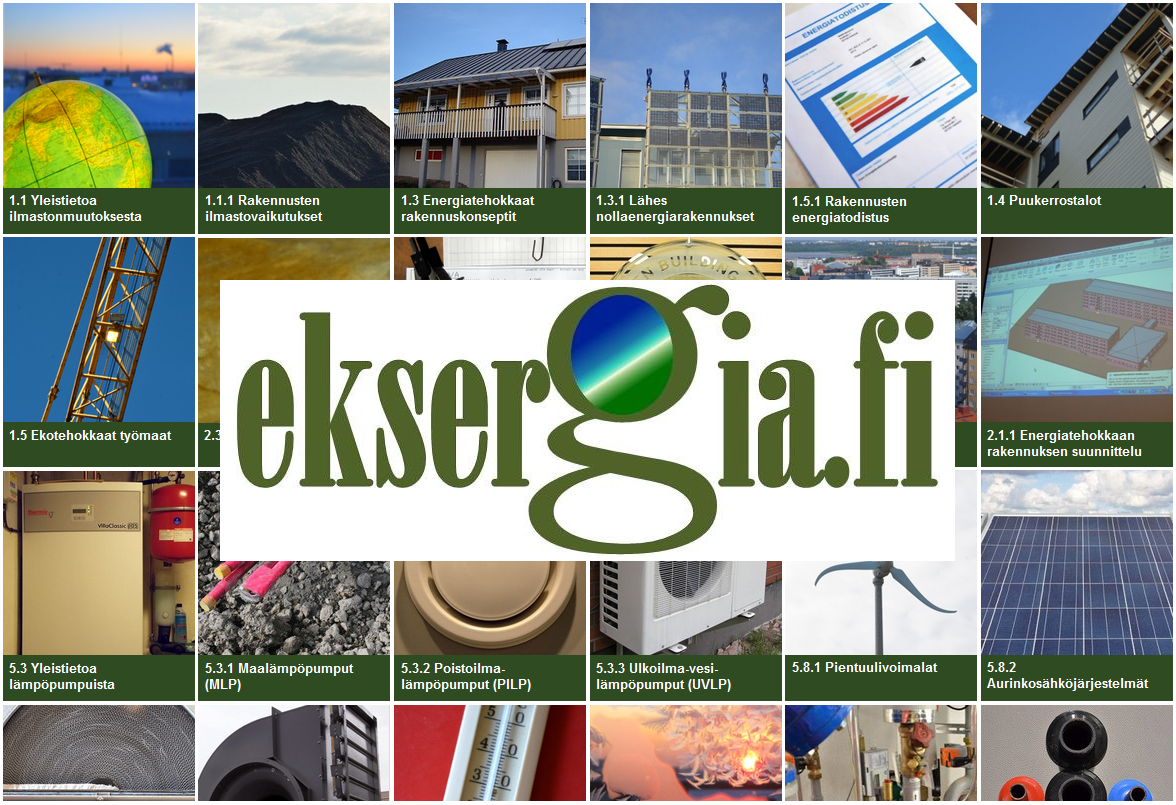 Eksergia -termi kertoo energian laadusta. Yleiseksi ja vapaasti käytettäväksi tietolähteeksi rakennettu Eksergia sisältää tällä hetkellä noin 100 suoraan opetusmateriaaliksi sopivaa kalvoesitystä niin uusiutuvasta energiasta, kuin energiatehokkaan rakentamisen suunnittelusta ja toteutuksesta. Dioja esityksissä on yhteensä yli 3 000 kpl. Hae tietoa haluamastasi aiheesta osoitteessa www.eksergia.fi!