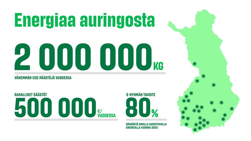 Yhteensä noin 37 000 aurinkopaneelia asennetaan muun muassa Prismojen, S-marketien ja ABC-asemien katoille ympäri Suomen. Paneelit tuottavat sähköä toimipisteiden omaan käyttöön.