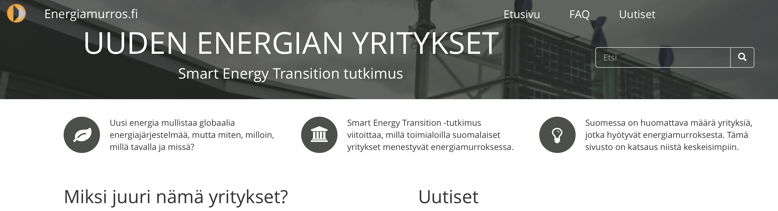 Suomen akatemian Strategisen tutkimuksen neuvoston rahoittama Smart Energy Transition –tutkimushanke viitoittaa, millä toimialoilla ja miten Suomi voi menestyä globaalissa energiamurroksessa. Rakkaudesta tieteeseen -tapahtuman yhteydessä 14.2.2018 julkistettiin Uuden energian yritykset -tietokanta, joka on toteutettu osana Smart Energy Transition -hanketta.