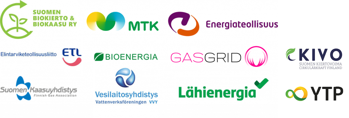 TEM, MMM, LVM, VM, YM, Bioenergia ry, Energiateollisuus ry, Envitecpolis Oy, Gasum Oy, Suomalainen Energiaosuuskunta SEO, Gasgrid Finland Oy, SYKE, Luke, Suomen Kaasuyhdistys ry, MTK ry, Suomen Biokierto ja Biokaasu ry, Vesilaitosyhdistys ry, Kiertovoima ry, Ympäristöteollisuus ja -palvelut YTP ry, Suomen Lähienergialiitto ry, Suomen Luonnonsuojeluliitto, Baltic Sea Action Group, John Nurmisen Säätiö, SDP, Vihreät, Keskusta, Vasemmistoliitto, Suomen ruotsalainen kansanpuolue, Kokoomus, Liike Nyt, Perussuomalaiset ja Suomen Kristillisdemokraatit KD.