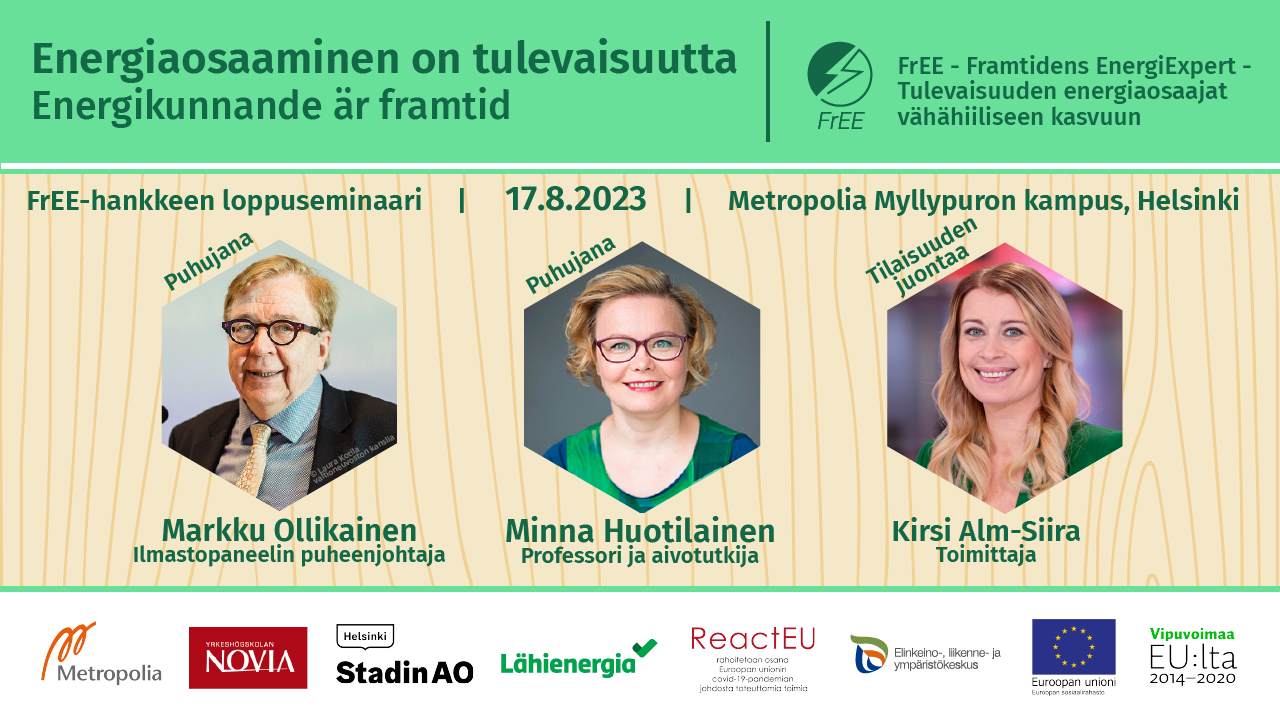 Torstaina 17.8.2023 järjestettävä tilaisuus päättää FrEE – Framtidens EnergiExpert – Tulevaisuuden energiaosaajat vähähiiliseen kasvuun -hankkeen. Tapahtumassa julkaistaan hankkeen tulokset ja pohditaan energia- ja talotekniikka-alan tulevaisuusnäkymiä ja osaamistarpeita.