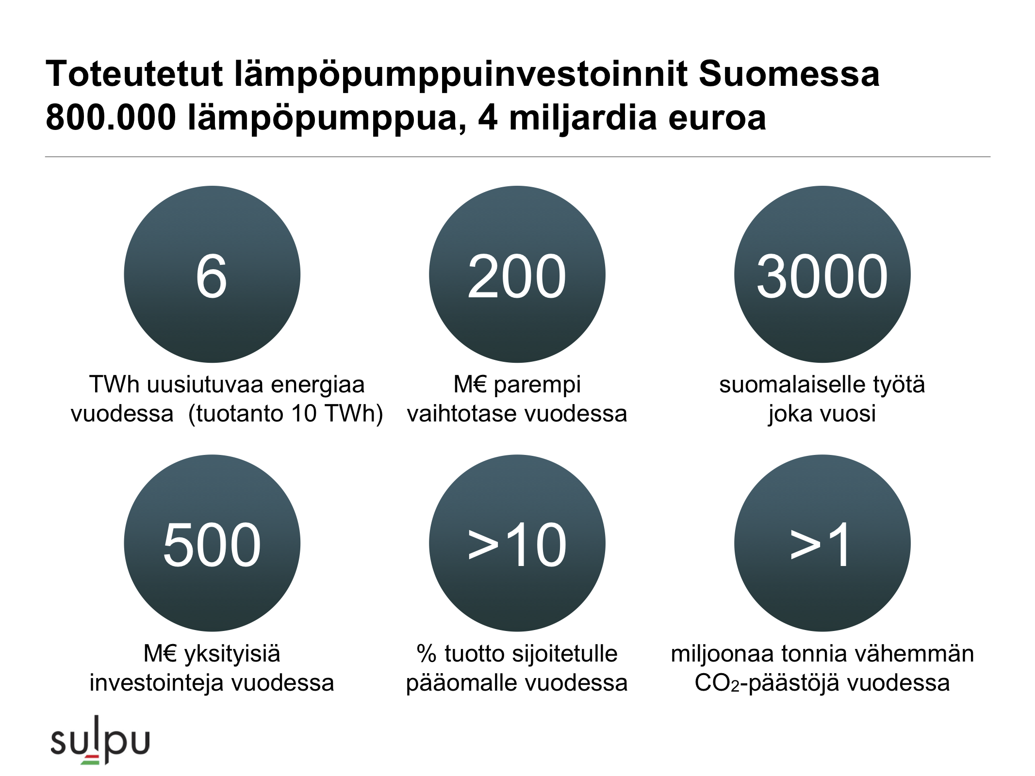 Lämpöpumput ovat tehneet läpimurron Suomessa 2000-luvun alussa uusiutuvan energian lämmitys- ja viilennysteknologiana. Tällä hetkellä Suomen lämmitysenergiasta yli 10% (> 10 TWh/vuosi) tuotetaan erityyppisillä lämpöpumpuilla, joita on jo pitkälti yli 800 000. Suomessa vuosittaiset investoinnit lämpöpumppuihin olivat vuonna 2017 noin 0,5 miljardia euroa.