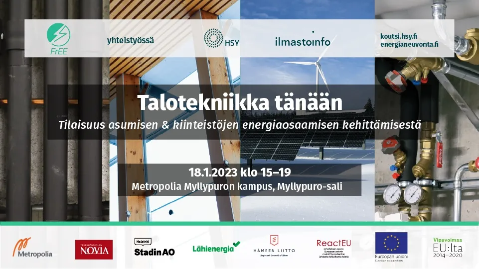 FrEE-hanke ja Helsingin seudun ympäristöpalvelut HSY järjestivät 18.1.2023 Metropolialla Talotekniikka tänään -koulutustilaisuuden, jossa keskusteltiin asumisen ja kiinteistöjen energiaosaamisen kehittämisestä. Tilaisuudessa oli yleisönä Uudenmaan pk-yritysten edustajia sekä muita alasta kiinnostuneita.