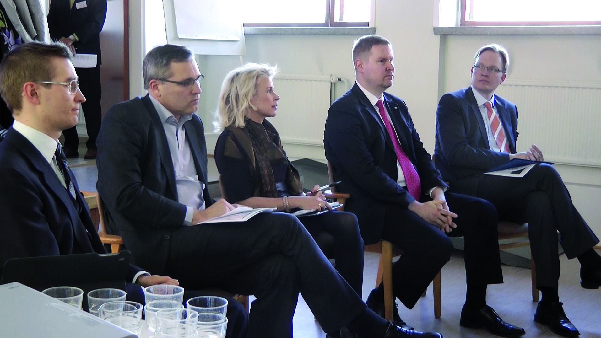 Kuva: Seminaarin paneeleihin osallistui poliitikkoja ja toimitusjohtajia. Kuvassa vasemmalta Oras Tynkkynen, Mikael Pentikäinen, Pia Kauma, Pasi Hurri ja Jukka Nieminen.