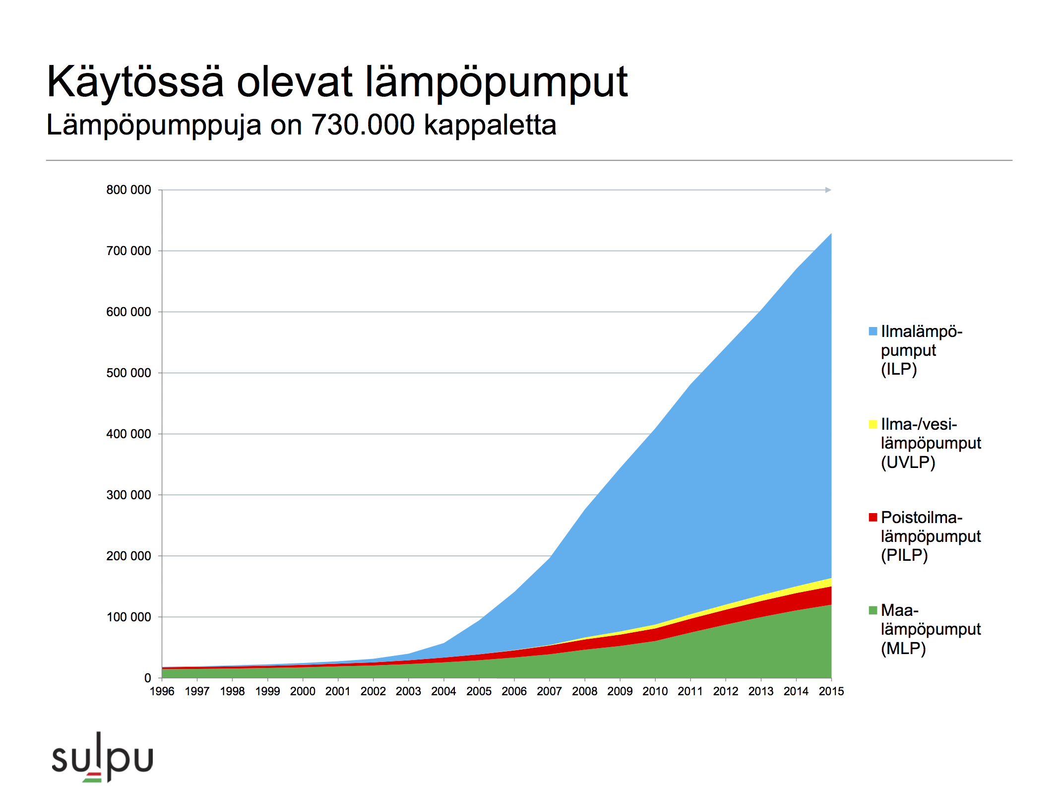 Suomessa on jo 730 000 lämpöpumppua. Ne raastavat talojen ympäriltä energiaa yli 5 terawattituntia vuodessa. Lämpöpumppu on ylivoimaisesti suosituin lämmitysmuoto uusissa pientaloissa ja ne korvaavat vauhdilla vanhoissa taloissa öljy- ja sähkölämmitystä ja myös kaukolämpöä. Suomalaiset sijoittivat vuonna 2015 lämpöpumppuihin noin 350 miljoonaa euroa, omia rahojaan.